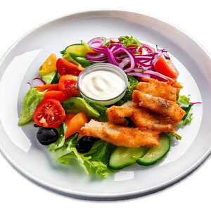 Insalata, cipolla ,cetrioli, olive nere, pollo, grana e yogurt
