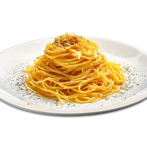 spaghetti con guanciale, uova, pecorino e crema di pistacchi