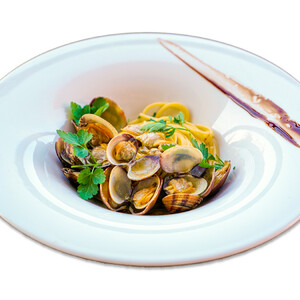 Spaghetti alle vongole e lupini pomodoro giallo prezzemolo e peperoncino