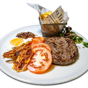Hamburger di manzo (200 gr) con uovo, cipolla caramellata, pomodoro e patatine fritte