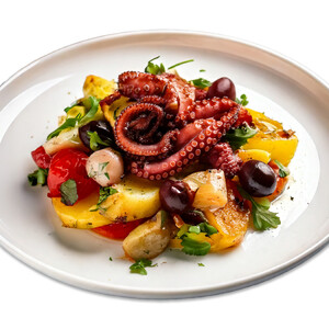 Polipo arrosto con gamberi, crema di patate e verdurine