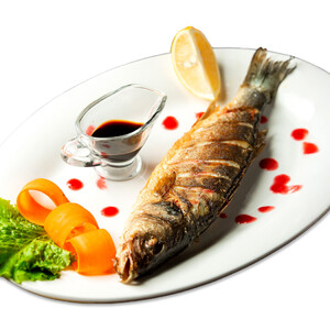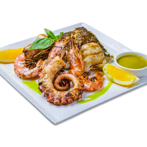 Filetto di branzino, gamberone, calamari, scampi e tonno